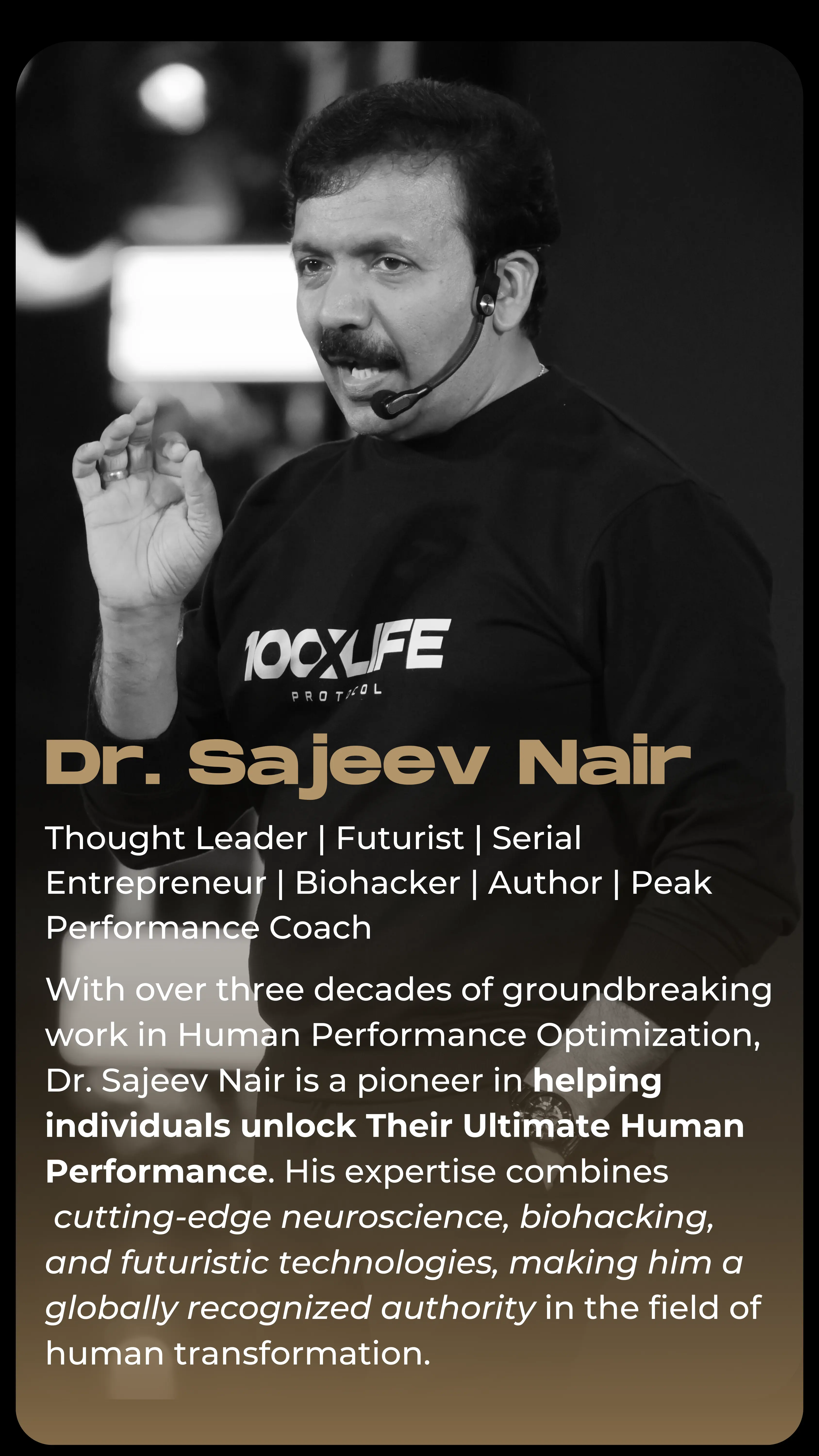With over three decades of groundbreaking work in Human Performance Optimization, Dr. Sajeev Nair is a pioneer inhelping individuals unlock Their Ultimate Human Performance. His expertise combines cutting-edge neuroscience, biohacking, and futuristic technologies, making him a globally recognized authority in the field of human transformation.